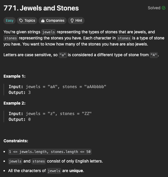 이 문제는 jewels는 문자열 형태로 한가지 문자들만 담고 있고, stones 안에는 다양한 문자열들이 있다.