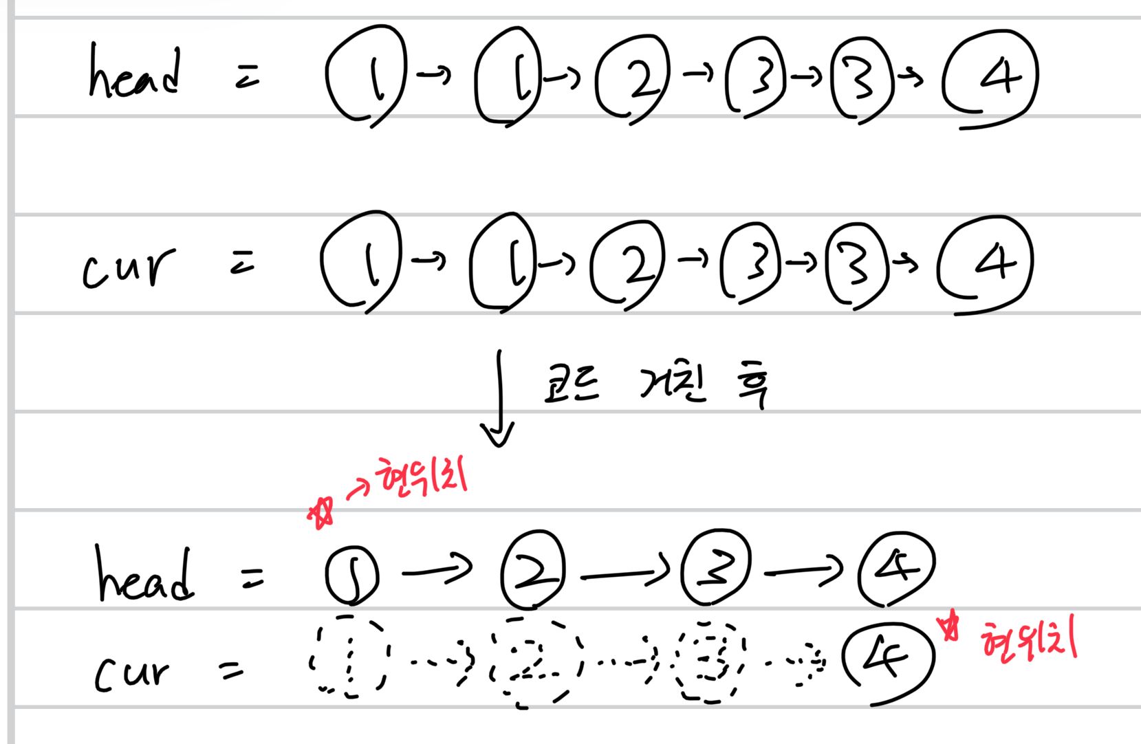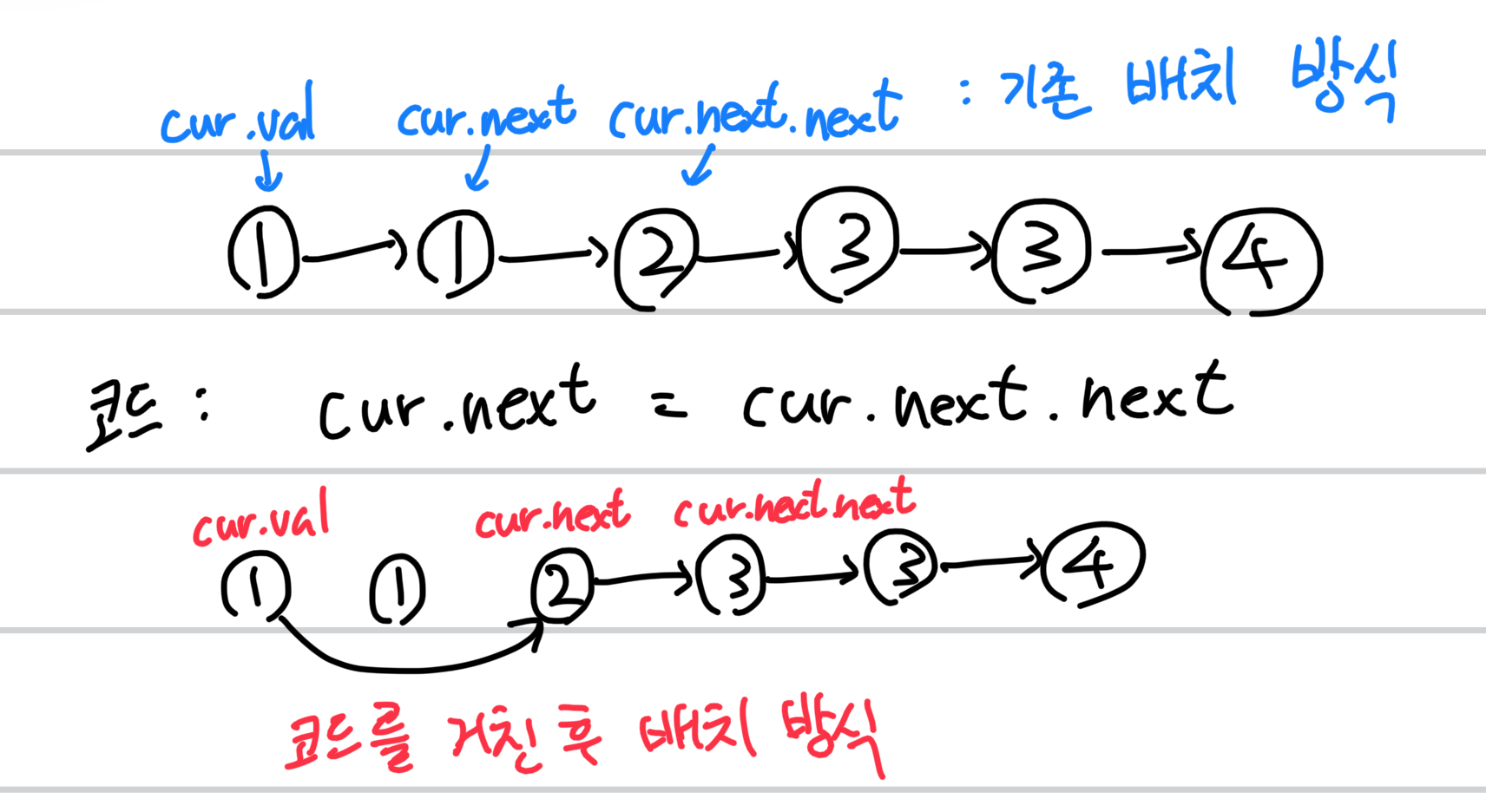 if cur.val != cur.next.val: # 중복이 아니면, 다음걸로 넘어가기