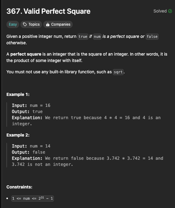 해당 문제는 루트 수식을 상용하지 않고서, 해당 숫자가 정수 제곱근이 있는지 알아보는 문제이다.