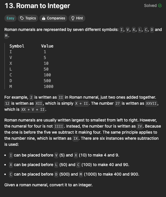 볼 때마다 헷갈렸고, 매번 같은 방식으로 풀어나가는 문제이다. 해답 코드는 다음과 같다.class Solution: def romanToInt(self, s: str) -> int: roman = dict(I=1, V=5, X=10, L=50, C=100, D=500, M=1000) num = 0 for i in range(len(s)-1): key, next_key = s[i], s[i+1] if roman[key] >= roman[next_key]: num += roman[key] else: num -= roman[key] ..