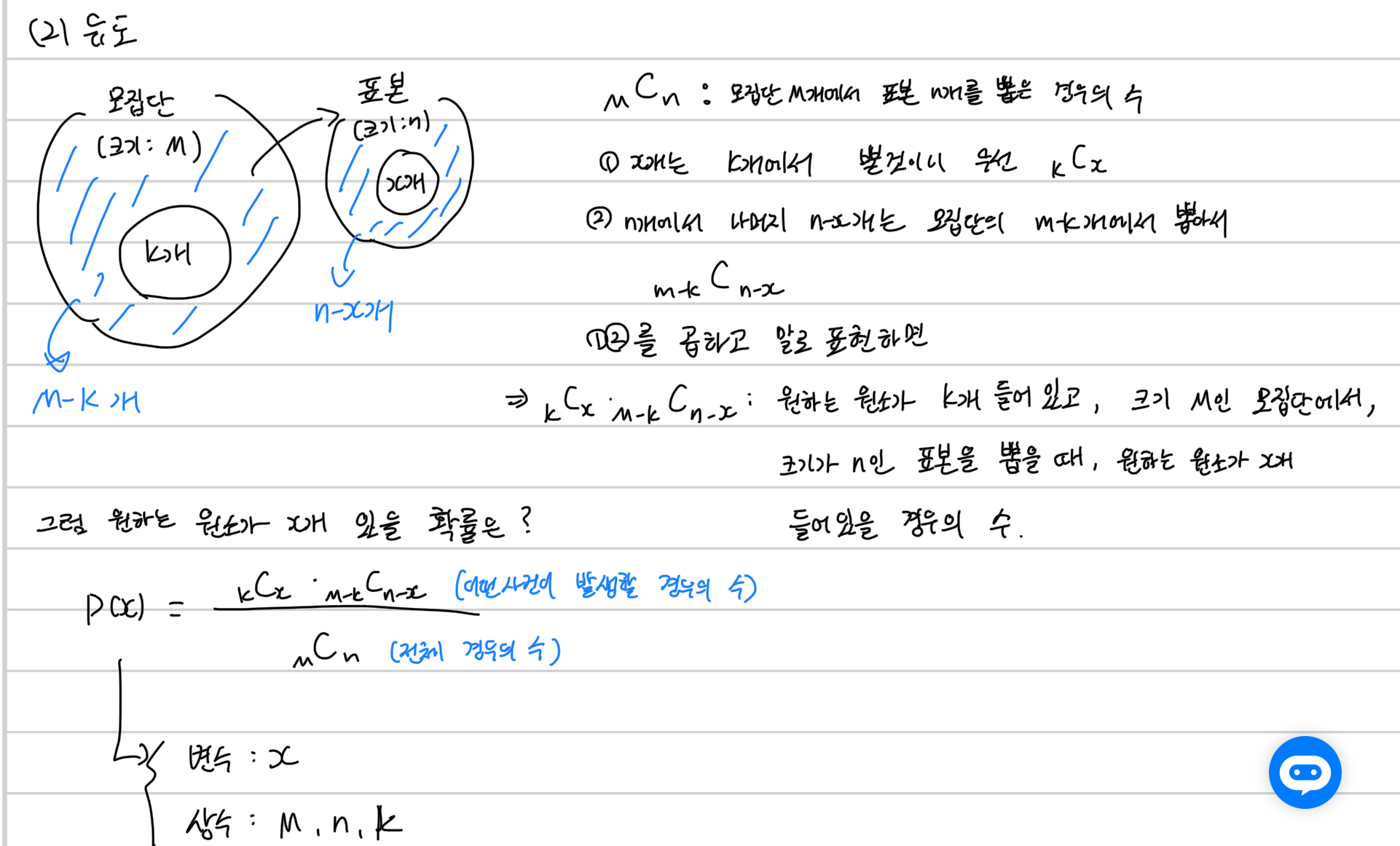 초기하 분포의 식은 다른 분포들과 다르게 조합(C)로 표현된다.