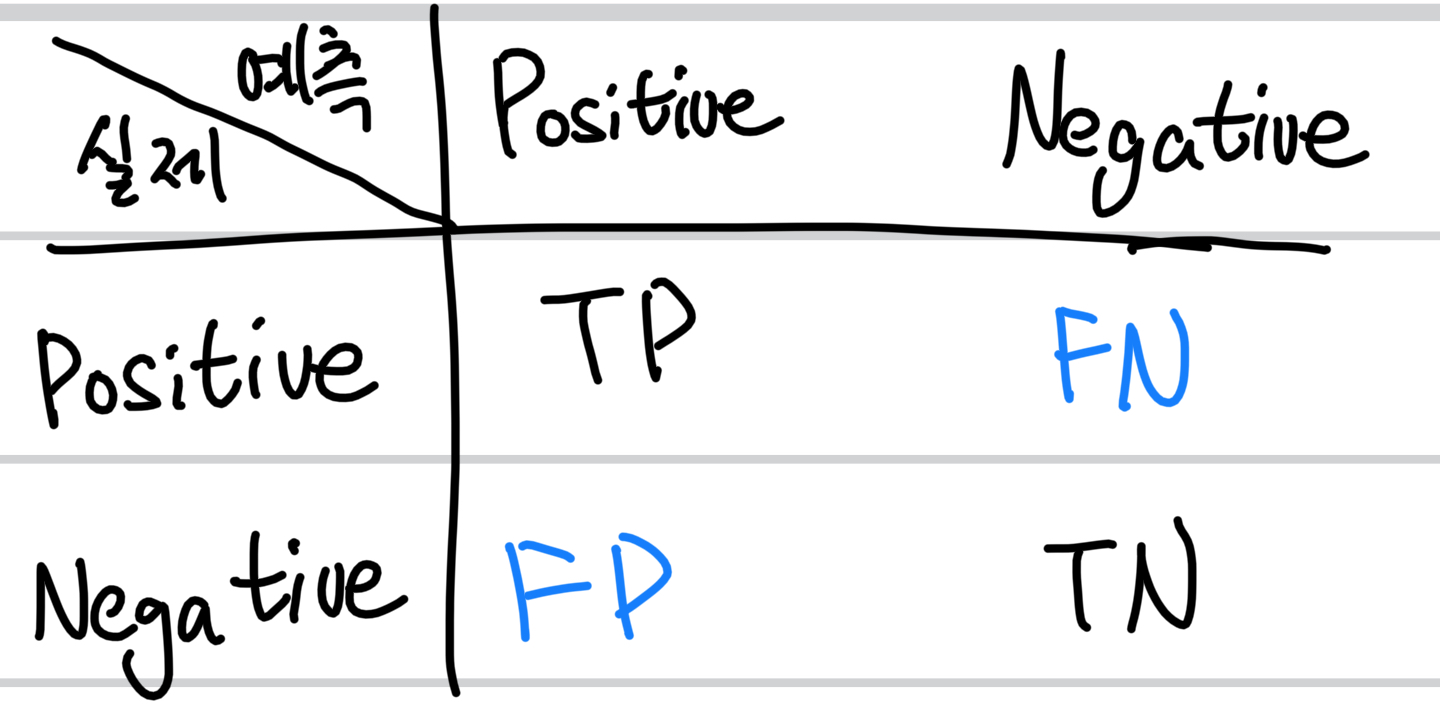 Precision의 의미: Positive(맞다)라고 예측한 것 중에서 진짜로 맞는(Positive한)것